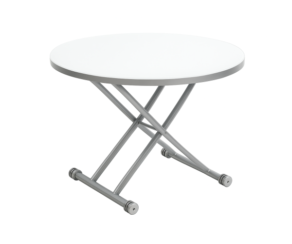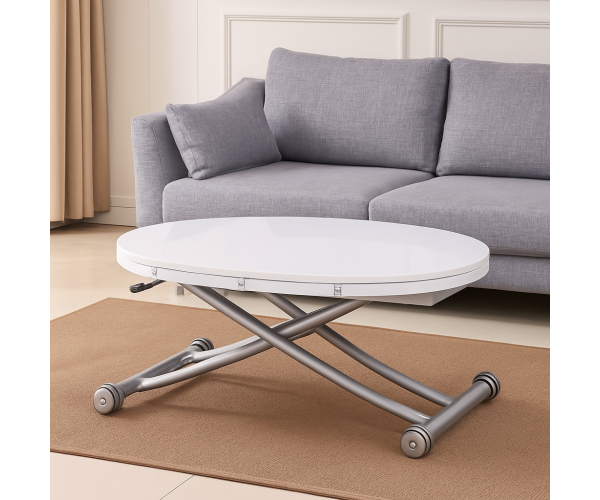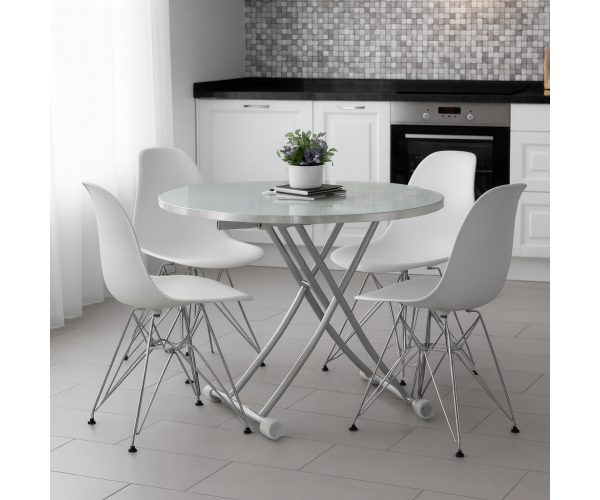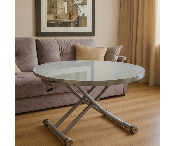Стіл обідній розкладний трансформер, круглий 90 см, розкладний, стільниця з дерева мдф 15 мм завтовшки, зверху скло, товщина скла 6 мм, колір стільниці білий, ніжки металеві фарбовані, колір сірий, на ніжках внизу накладки для захисту підлоги, колеса з механізмом блокування, стіл піднімається вгору і опускається, регулювання висоти від 30 см до 74 см, перетворюючись в обідній стіл за допомогою механізму, стільниця розкладається, розмір столу: діаметр 90 см, в складеному вигляді ширина стільниці 59 см, висота обіднього столу 74 см, висота журнального столу регулюється за вашим бажанням.