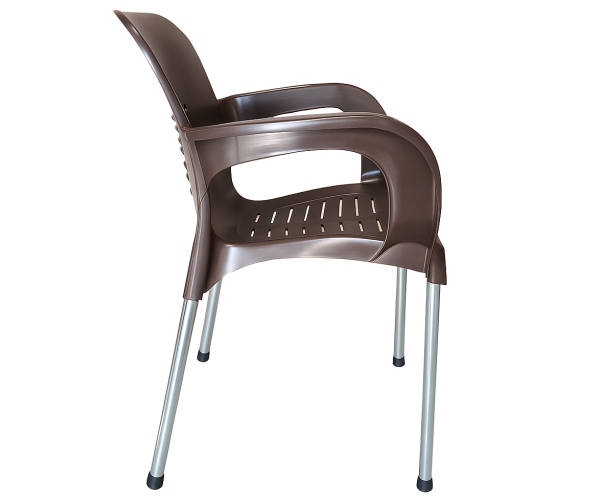 Стілець пластиковий, матеріал поліпропілен, ніжки з алюмінію, стілець штабельований, ставиться в стопки, протиультрафіолетова обробка, антистатична обробка, стілець для внутрішнього та зовнішнього використання, розмір стільця: ширина 60 см, глибина 50 см, висота від підлоги до верху спинки 80 см. Витримує навантаження 120 кг. Стілець з підлокітниками та зручною спинкою, виготовлені із пластику поліпропілен, поєднує в собі затишний дизайн та високу якість. Ніжки металеві алюмінієві міцні та стійкі. Стільці ставляться в стопки. Ці лаконічні прості стільці створюють теплу та затишну атмосферу у будь-якому приміщенні. Стілець для обідніх приміщень на відкритому повітрі.