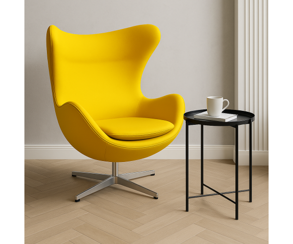 Елегантне та комфортне дизайнерське крісло Егг — ідеальне поєднання сучасного стилю, якості та зручності. Його продумана ергономіка та витончений дизайн гармонійно впишуться як в офісний простір, так і в домашній інтер’єр. Матеріал оббивки високоякісна екошкіра, приємна на дотик, стійка до зношування та легка у догляді, наповнювач це щільний пінополіуретан, регулюється кут нахилу спинки у двох положеннях — для роботи та відпочинку, а міцна хрестовина з полірованого алюмінію додає блиску та надійності конструкції. Крісло обертається навколо своєї осі, висота сидіння фіксована без підйомного механізму. Розмір крісла: ширина спинки вгорі 80 см, ширина по підлокітникам 77 см, висота спинки 69 см, висота від підлоги до сидіння 44 см, висота загальна від підлоги до верху спинки 110 см.