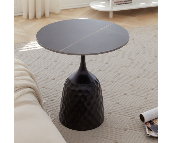 Журнальний столик з металевою основою та керамічною стільницею, малюнок мармур. Цей стильний журнальний столик поєднує в собі сучасний дизайн, високу функціональність та довговічність. Завдяки оригінальній металевій основі з фактурною поверхнею він стає яскравим акцентом у будь-якому інтер’єрі — від мінімалізму до сучасної класики. Керамічна кругла стільниця діаметром 50 см, має гладку, стійку до подряпин та високих температур поверхню. Вона не вбирає рідину, легко очищується та зберігає первинний вигляд навіть за активного використання. Висота столика 61 см робить його ідеальним рішенням для вітальні, зони відпочинку, спальні або лаунж-зони. Він зручний для розміщення напоїв, декору, книг, а також може використовуватися як приставний столик біля дивана чи крісла. Розмір столику: діаметр 50 см, висота 61 см.